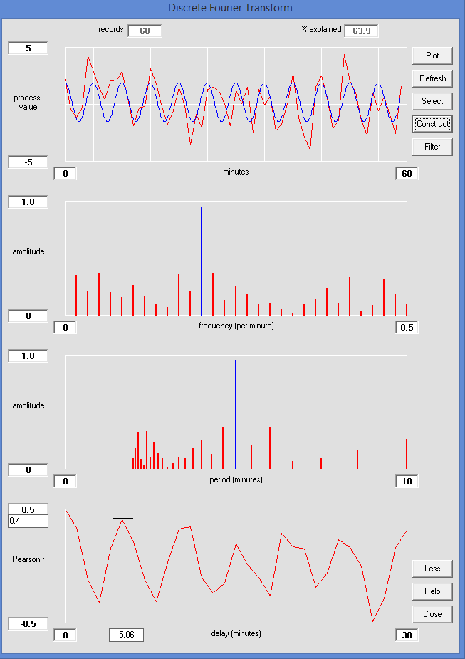 Fourier transformation will indentify the frequencies of any repeating pattern in the process data. The result is a spectrum showing the amplitude of each frequency. This might be used to help identify the source of an oscillation somewhere in the process. If this cannot be resolved, then the spectrum can also be used to design a filter. The user can select the dominant frequencies to plot a synthesised process trend. The software displays a '% explained' parameter indicating how much of the variation in the original signal has be modelled. The plot can be based on either discrete or continuous data.