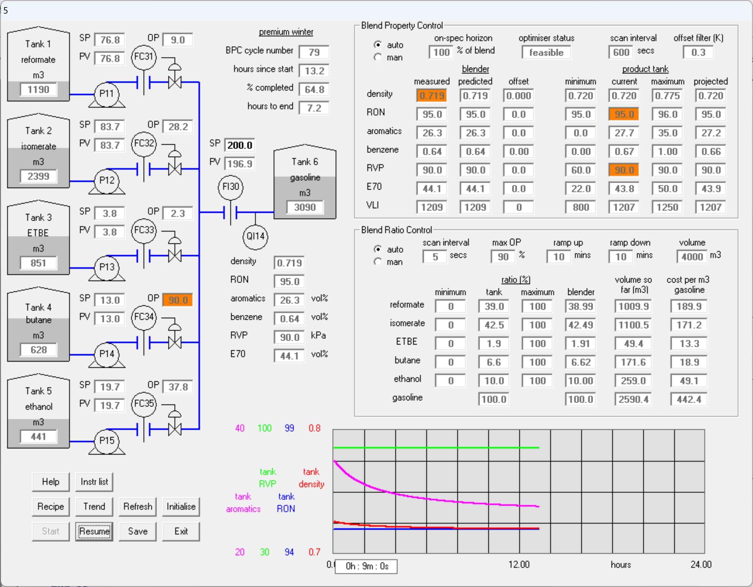 A wide selection of variables may be trended including all the properties of either the blender or the tank, as well as blend component ratios and tank composition.