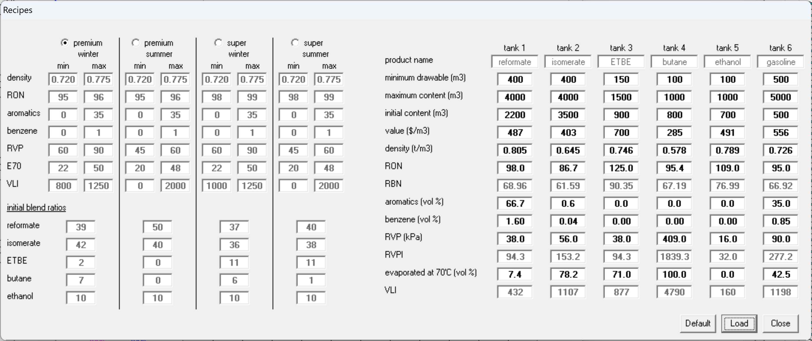 Up to five common components may be blended to meet multiple product specifications for four diffrent grades of gasoline. The user selects the recipe - changing, as required, any of the component properties and quantities. Once the default blend ratios are loaded into the blend ratio controller (BRC), the user may change the ratios and add any constraints. The user specifies the batch size and the total blend flow rate. BRC ramps up the start and ramps down completion of the blend. The ramp rates are configurable.Once started, if a hydraulic constraint is reached by any component, BRC reduces the total flow in order to maintain the required belnd ratios. It also monitors component availability and will terminate the blend if any fall below the specified minimum drawable volume.