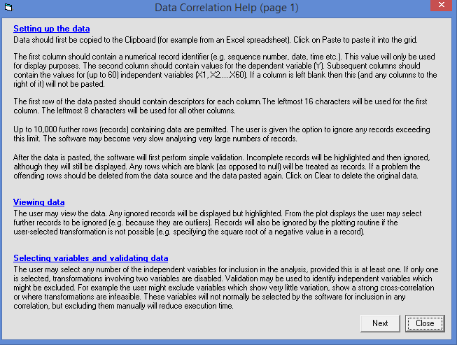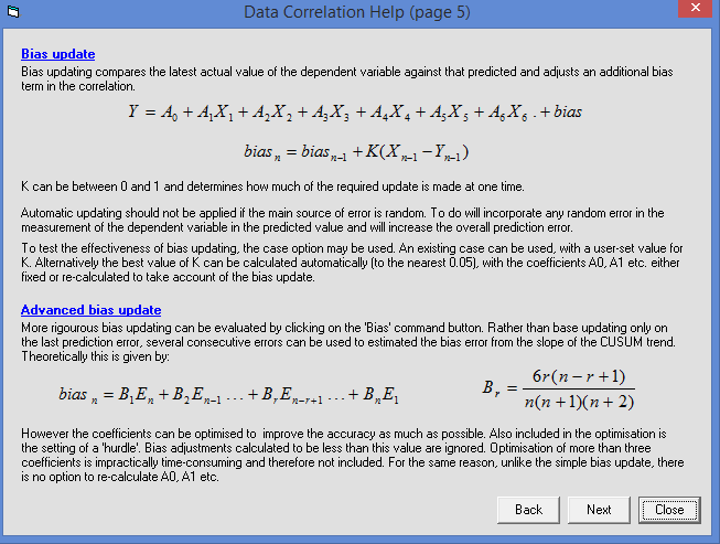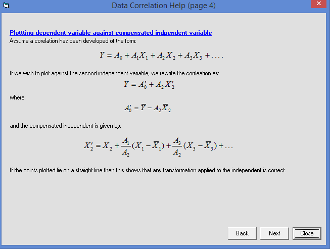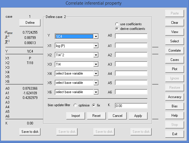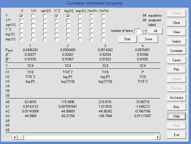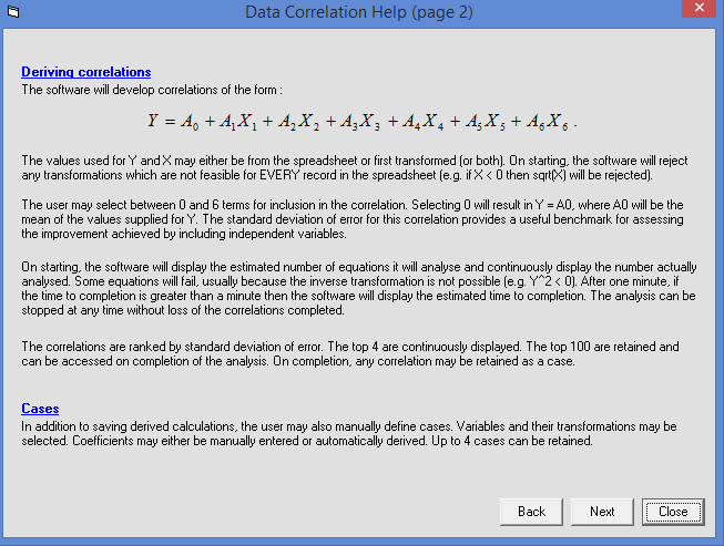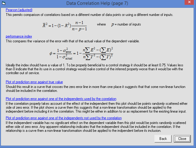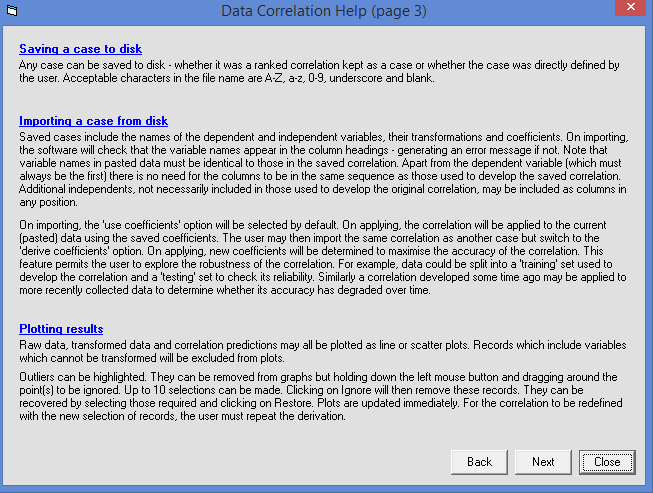 Correlations can be saved to disk. This permits the user to explore the robustness of the correlation. For example, data could be split into a 'training' set used to develop the correlation and a 'testing' set to check its reliability. Similarly a correlation developed some time ago may be applied to more recently collected data to determine whether its accuracy has degraded over time.