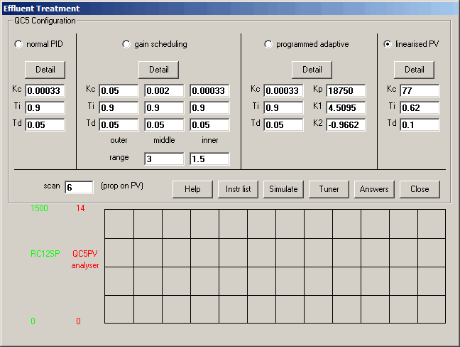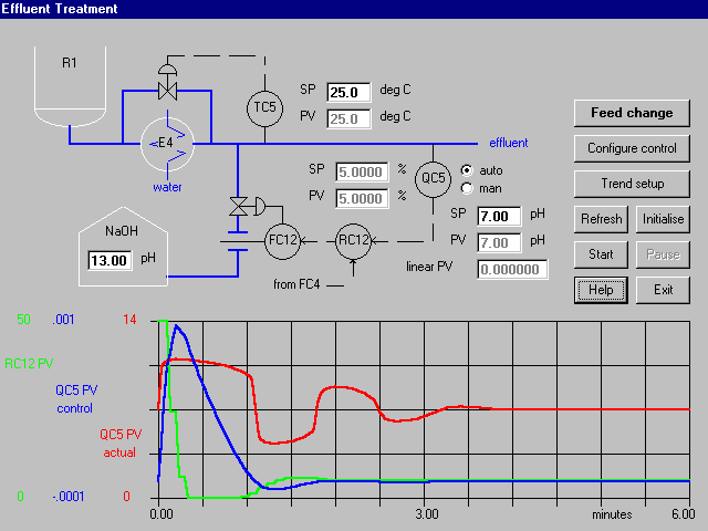 This addresses the problem of controlling highly non-linear processes. Although the example is based on pH control, many of the techniques covered can be more generally applied. The user can experiment with linear control, gain scheduling, programmed adaptive control and PV linearisation. The effect that temperature has on pH control can be investigated.