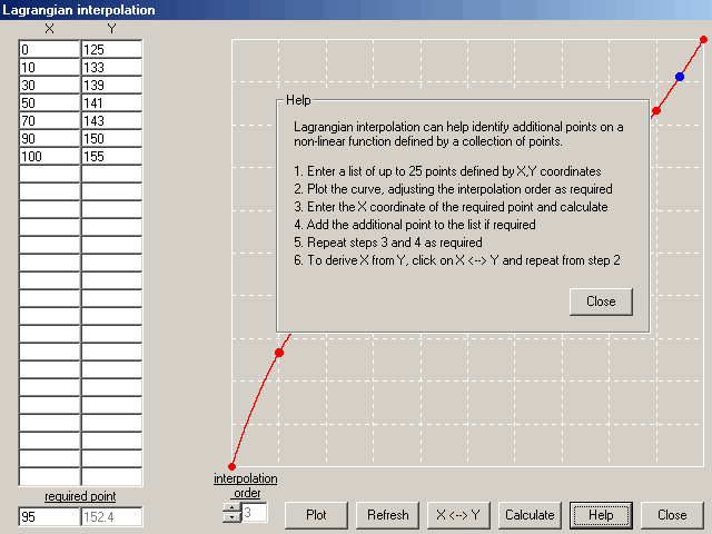 Non-linear interpolation is useful in determining additional points on curves. The technique is commonly applied to distillation curves. The example below shows how the 95% point can be determined from the data provided. The technique however can be applied to any non-linear function.