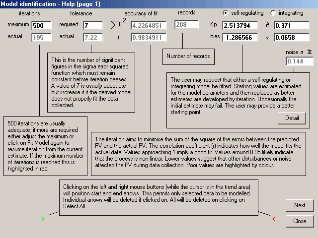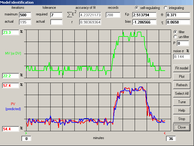 It will model both self-regulating and integrating processes. In addition to the dynamic constants it will also estimate the level of measurement noise. The user can select which of the data are used in modelling, for example to exclude other process disturbances.