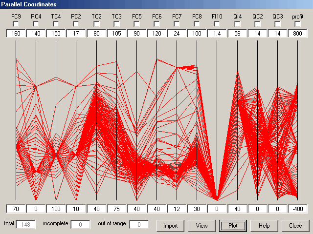 Parallel coordinates permit large volumes of historical process data to be analysed, possibly as a precursor to the implementation of multivariable control. By changing the plot ranges, data sets which violate any of the lower or upper limits will be excluded. Including a measure of profitability as one of the parameters also permits only high profit operating conditions to be displayed. The remaining data sets can then give a clear indication of the operating strategy that will be adopted by the multivariable controller. Even without multivariable control, this tool can be useful in identifying optimum operating strategies. Data are simply imported via a spreadsheet.