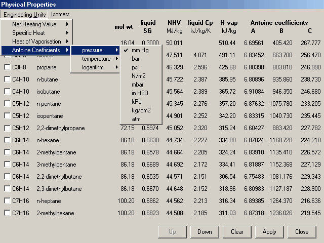 Physical properties for all the common chemicals may be displayed in user-selected engineering units. Up to 10 components may be selected and blended properties calculated. Data can be readily transferred to other Toolkit modules, such as pressure compensated temperature calculations.